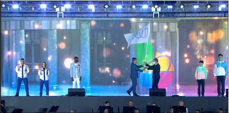 在暖场文艺表演、精彩回顾、无人机表演、入场仪式、嘉宾致辞等环节后,伯明翰世运会闭幕式迎来接旗仪式和“成都时间”文艺展示。在接旗仪式环节,国际世界运动会协会会旗从美国伯明翰交接到中国成都。随后,成都作为下一届世界运动会举办城市,精彩呈现了“成都时间”大型展演活动。
