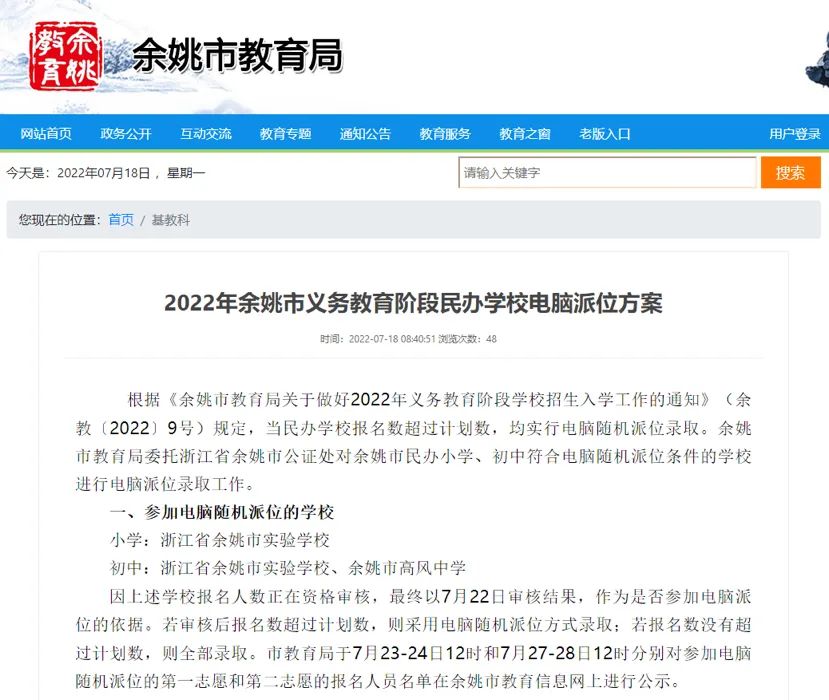 今天,余姚市教育局正式发布2022年余姚市义务教育阶段民办学校电脑派位方案。