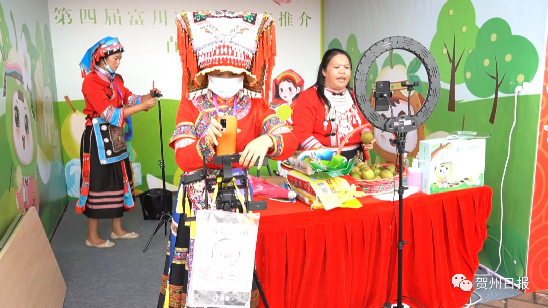 图为在2022年广西党旗领航·乡村振兴“我为家乡代言”活动启动仪式暨贺州市电商大集现场,农户在直播推介农副产品