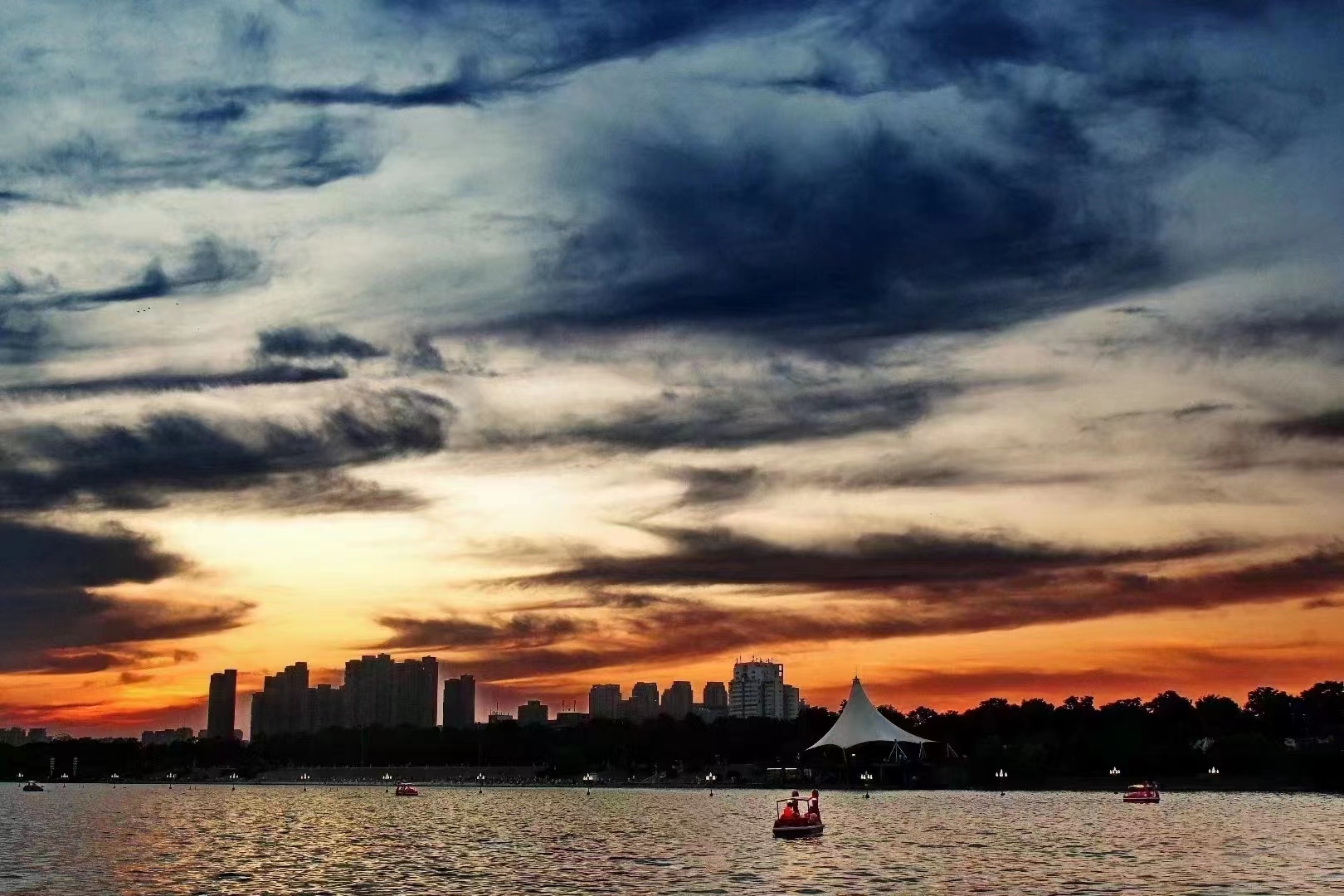 晨曦灯,晚霞红,四季青。苦水无常,嗟叹薄情。临夕食无言,屯荫花草静。中流雨露叶蕊,朝阳花开繁星。独枕遥远托雄鹰,龙湖岸边牧水宫。
