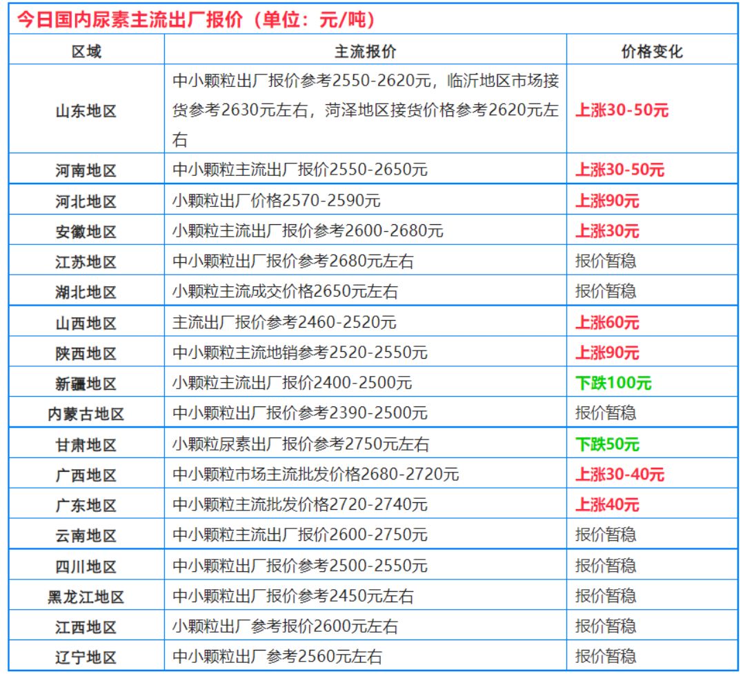 从7月18日尿素价格详情来看,上涨地区主要集中在山东、河南、河北、安徽、山西、陕西、广西、广东等地区。其中,山东地区每吨上涨30-50元,主流出厂价格在2550-2630元/吨;河南地区每吨上涨30-50元,出厂价格在2550-2650元/吨;河北地区每吨上涨90元,主流出厂价格在2570-2590元/吨;安徽地区每吨上涨30元,主流出厂价格在2600-2680元/吨;山西地区每吨上涨60元,主流出厂价格在2460-2520元/吨;陕西地区每吨下上涨90元,主流出厂价格在2520-2550元/吨;新疆地区每吨下跌100元,主流出厂价格在2400-2500元/吨;甘肃地区每吨下跌50元,主流出厂价格在2750元/吨左右;广西地区每吨上涨30-40元,主流出厂价格在2680-2720元/吨;广东地区每吨上涨40元;主流出厂价格在2720-2740元/吨。