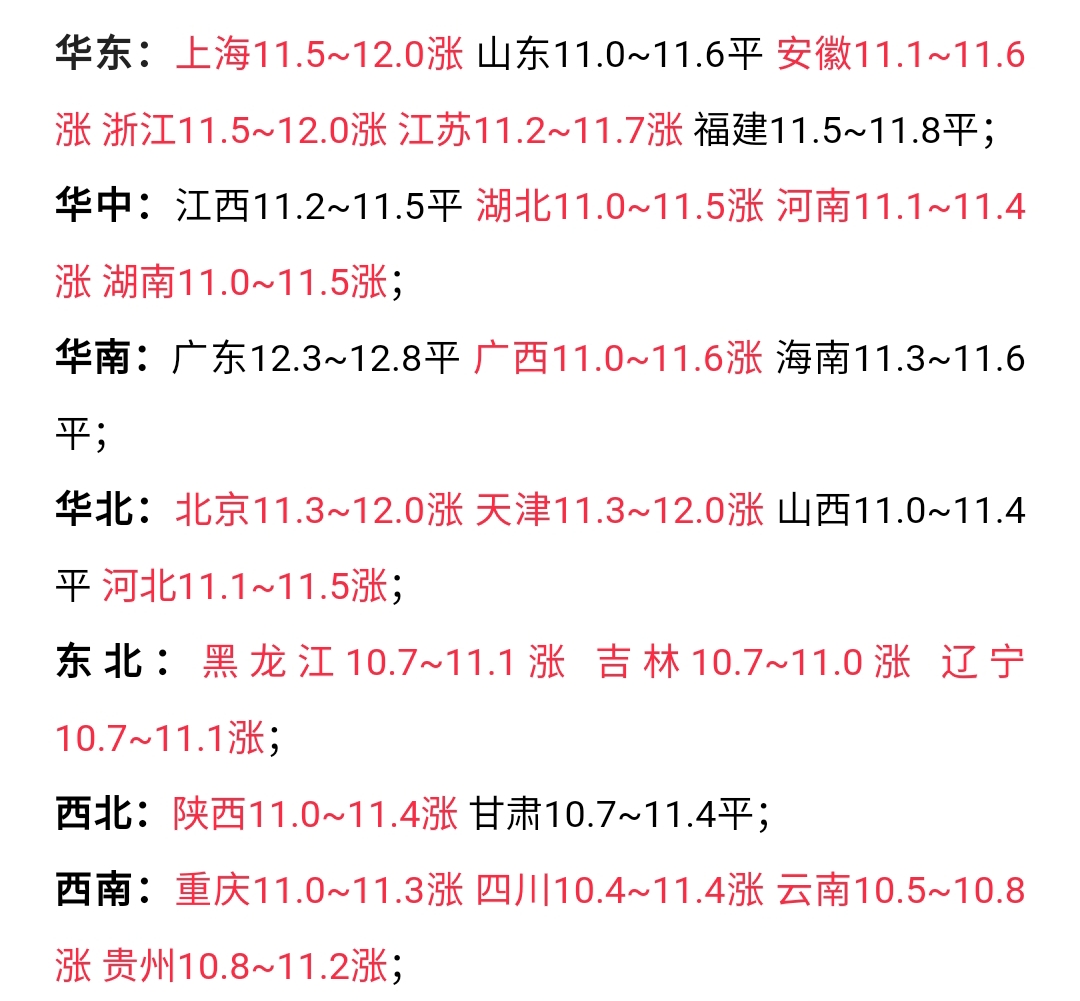 从7月19日猪价详情来看,猪价止跌上涨,全国除了山东、福建、江西、广东、海南、山西、甘肃猪价与昨天持平以外,其它地区全面上涨。目前,收购价格最高的地区是广东地区,收购价格为每吨12.3-12.8元/斤;收购价格最低的地区是吉林,收购价格为每斤10.7-11元。
