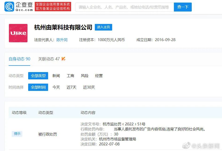 企查查APP显示,Ulike脱毛仪关联公司杭州由莱科技有限公司近日新增一则行政处罚,处罚事由为当事人委托发布的广告内容低俗,违背了良好的社会风尚,被杭州市市场监督管理局罚款30万元。