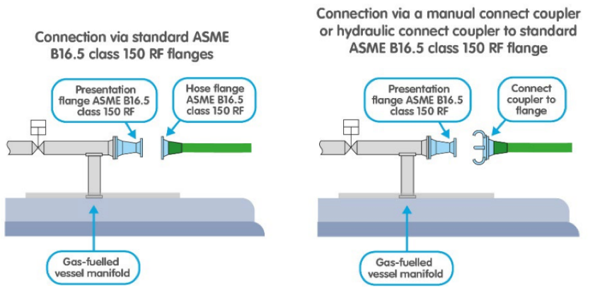 3. 如果因为荷载计算存在不可接受的泄漏风险而判定干式接头连接不合适,则应通过以下其中一种根据IGF规则替代设计条款获得批准的替代连接方式实现软管加注系统与气体燃料船管汇法兰的连接(参考图2示例)。
