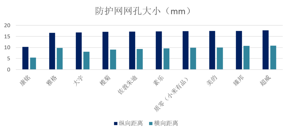 一般电蚊拍防护网网孔大,蚊子容易进去,但人的手指也容易碰到中间的电网,因此防护网网孔大小应平衡安全性与灭蚊效率。试验发现,9款样品的防护网网孔大小基本一致,纵向距离均在17mm左右。康铭的防护网网孔最小,纵向距离为10.25mm。