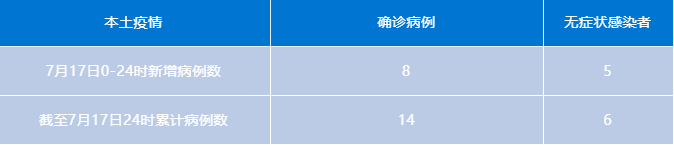 7月17日0-24时,成都市新增本土确诊病例8例,新增本土无症状感染者5例。截至7月17日24时,成都本轮疫情累计报告本土确诊病例14例,本土无症状感染者6例。