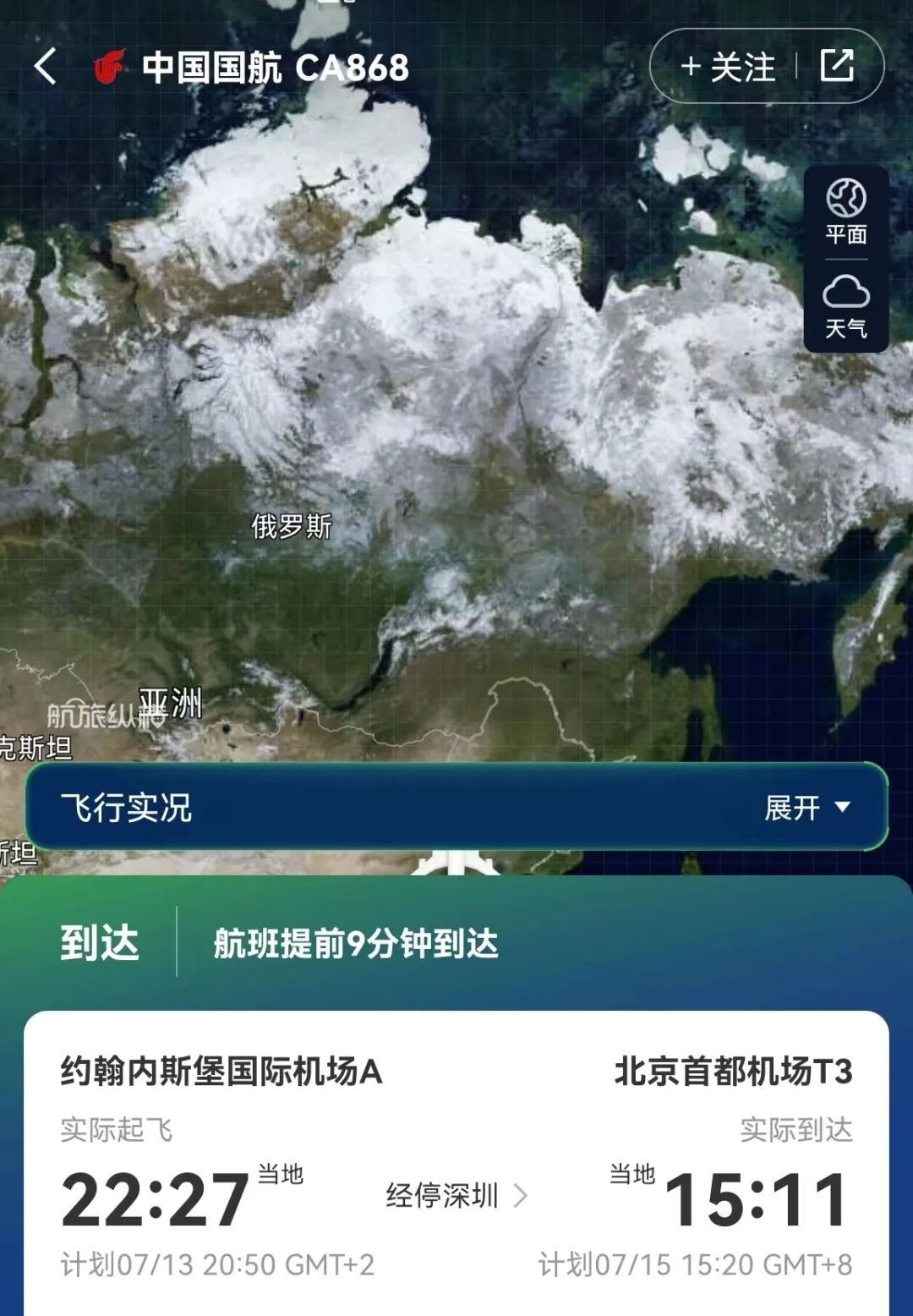 记者查阅航班信息显示,这一国际航班是北京往返南非约翰内斯堡,7月13日由北京经深圳飞往约翰内斯堡,于当地时间18点54分落地,并于当天的当地时间22点27分从约翰内斯堡起飞,飞回深圳。由于这一国际航班的第一入镜点是深圳,所有旅客要从深圳下飞机并在当地进行隔离,机组则是第二天空机飞回北京。