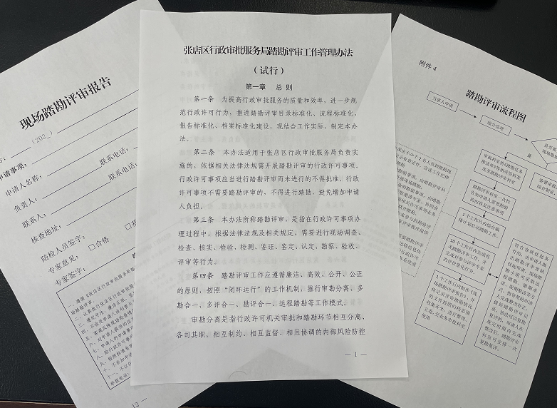 踏勘标准,有章可循。制定《张店区行政审批服务局踏勘评审管理办法》,进一步规范行政许可行为,推进踏勘评审目录标准化、流程标准化、报告标准化、档案标准化建设,梳理业务范围内有关行政许可踏勘评审事项,对许可事项以标准化的形式确定现场勘验项目、标准、要求和工作纪律等报告内容,规范工作规程,让申请人和勘验人员都有明确、清晰、统一的勘验标准,使审批权力得到了有效的监督,杜绝勘验评审中不廉洁情况的发生,有效的防范审批许可中的廉政风险,大大提升行政许可勘验评审质效。