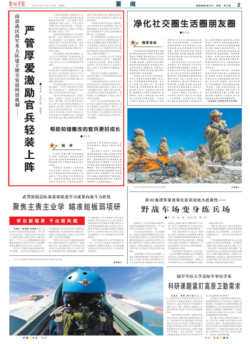 “追责问责既要依法度,也要有温度。不能因一个处分,让年轻干部从此一蹶不振。”该大队领导告诉记者,近年来,部队转型发展面临不少新情况、新问题,有的官兵因工作经验不足等原因出现失误。为引导官兵放下思想包袱、大胆干事创业,该大队党委召开专题研讨会,以法规制度为依据,建立健全容错纠错机制,坚持严管与厚爱并重,加强对犯错官兵的关心关爱,鼓励他们从挫折中重新站起来。
