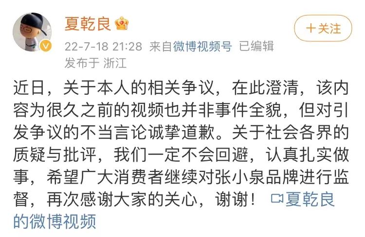 18日晚,张小泉总经理在个人账号@夏乾良 发文回应。