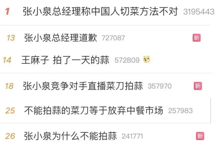 7月18日,“张小泉总经理称中国人切菜方法不对”的相关话题迅速冲上热搜首位,引发热议。其他相关话题也纷纷登上热搜榜。
