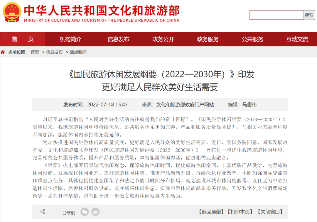 据文化和旅游部消息,为加快推进国民旅游休闲高质量发展,更好满足人民群众的美好生活需要,近日,经国务院同意,国家发展改革委、文化和旅游部联合印发《国民旅游休闲发展纲要(2022—2030年)》,旨在进一步优化我国旅游休闲环境,完善相关公共服务体系,提升产品和服务质量,丰富旅游休闲内涵,促进相关业态融合。