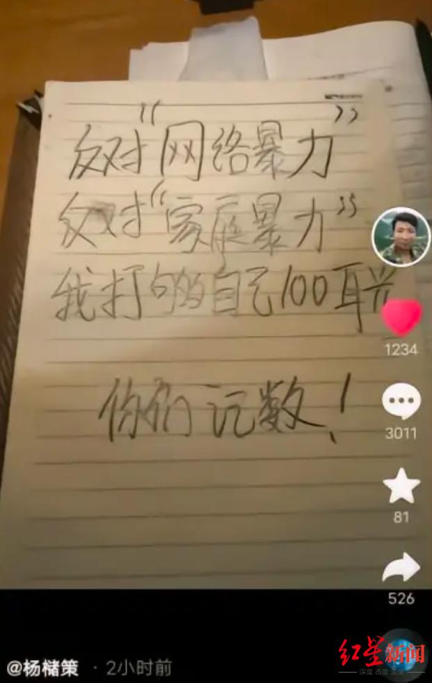 7月18日,诗人余秀华的前男友杨槠策在直播写下“反对‘网络暴力’,反对‘家庭暴力’,我打够自己100耳光,你们记(计)数!”后,连扇自己超100个耳光。