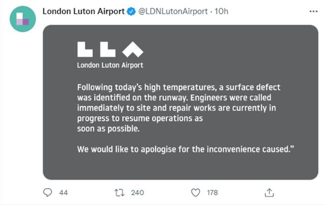 18日,伦敦卢顿机场在推特上表示:“在今天的高温之后,跑道上出现了地面塌陷。”机场宣布,为了进行“必要的跑道维修”,当天下午3点后,所有进出航班暂停,直到晚上6点以后才恢复运营。