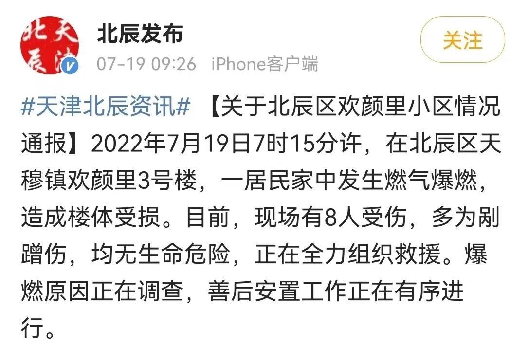 据天津市北辰区人民政府官方微博通报,2022年7月19日7时15分许,在北辰区天穆镇欢颜里3号楼,一居民家中发生燃气爆燃,造成楼体受损。