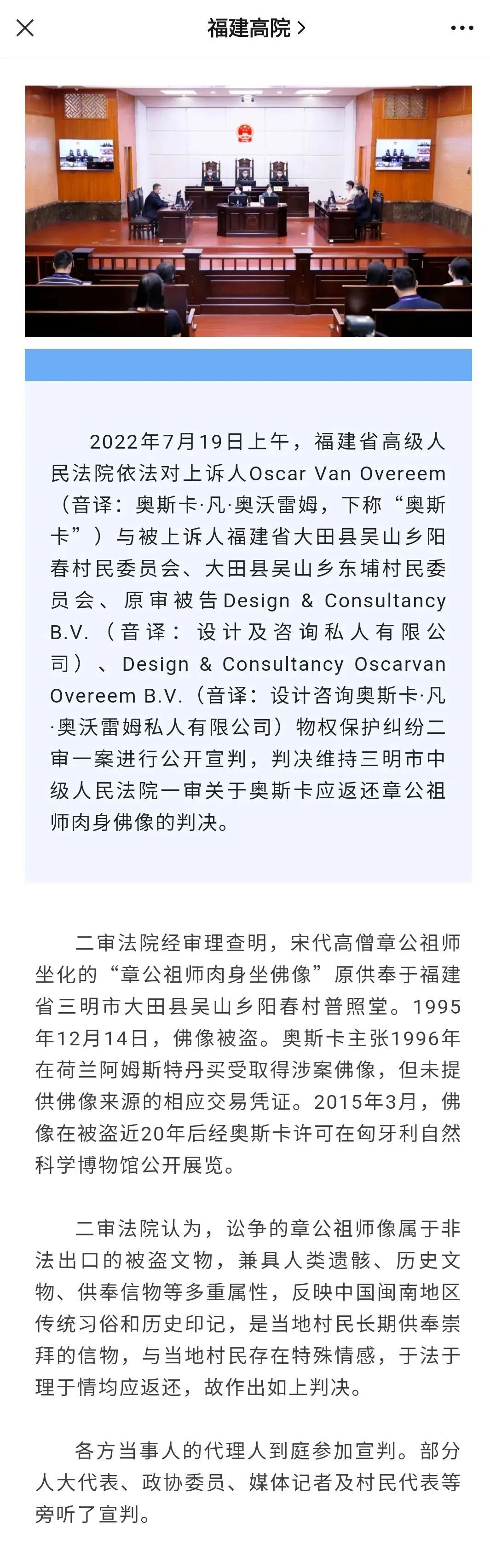 据央视新闻客户端消息,2020年12月4日下午,福建省三明市中级人民法院对原告福建省大田县吴山乡阳春村民委员会、大田县吴山乡东埔村民委员会诉被告Oscar Van Overeem(音译:奥斯卡·凡·奥沃雷姆)、Design Consultancy B.V.(音译:设计及咨询私人有限公司)、Design Consultancy Oscarvan Overeem B.V.(音译:设计咨询奥斯卡凡·奥沃雷姆私人有限公司)物权保护纠纷一案进行公开宣判,判令被告奥斯卡·凡·奥沃雷姆在判决生效之日起三十日内向原告福建省大田县吴山乡阳春村民委员会、东埔村民委员会返还案涉“章公祖师”肉身坐佛像。