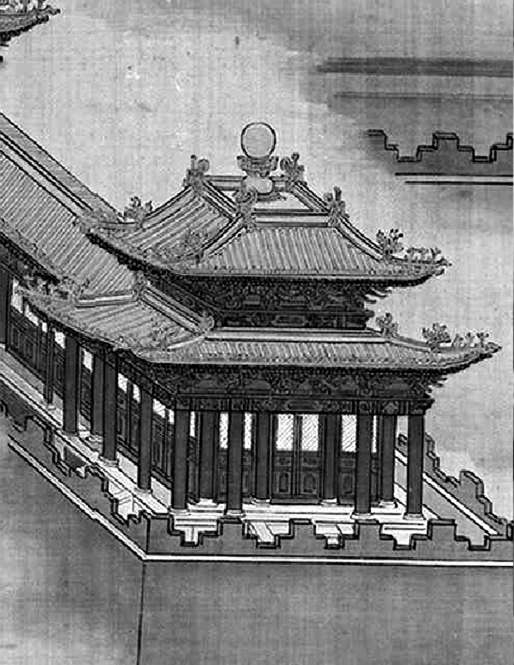 由此可见,午门在李自成撤出北京时被焚毁,三年后清王朝将其重建,而这次工程也是整个清代对午门的唯一一次重建工程。因此,基本可以断定,正是在1647年的这次“重建”中,午门方亭的顶部结构被改换了样式。在不影响等级规制的前提下,之前明代玲珑繁复、颇费工时的“箓顶”,被转变为了更加简约并省工省时的“攒尖顶”。毕竟王朝初创,百废待兴,一切工程势必从简,这也在情理之中。