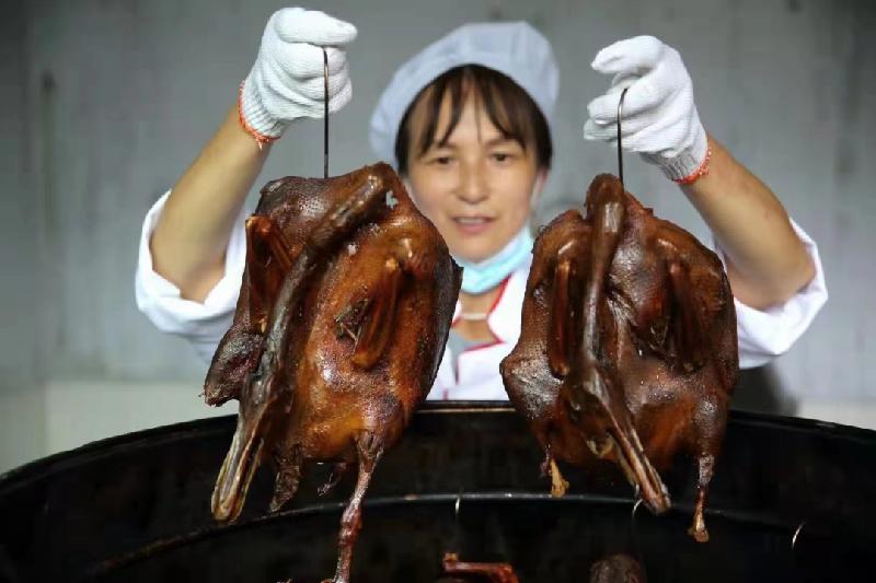 “雪山酱板鸭目前已经拥有雪山酱板鸭养殖基地1个,通过农家自养优质土鸭,以烤、卤、酱、浇等多重工艺,采用40多种养生中药和农家土麻鸭,经过13道工序熬制而成营养浓香的酱汁,将鸭肉沁入汤汁中,使鸭肉香辣鲜美。”蔡香华说。