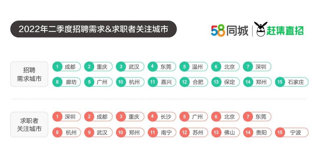 同时也反映出人才在城市流动过程中,对经济有潜力、保障有体系、环境有特色的宜居城市更为偏爱。据报告显示,成都、重庆、武汉、东莞、温州、北京、深圳、廊坊、广州、杭州等城市招聘需求旺盛,各城市企业的发展信心、经营预期正在企稳转强。