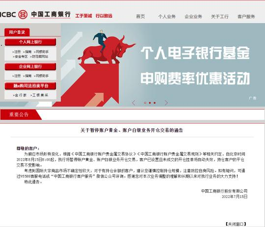 此前,工商银行已经发布公告,对代理上海黄金交易所个人贵金属交易业务进行调整。宣布自8月15日9:00起,将暂停代理上海黄金交易所个人贵金属延期交收合约的开仓交易和代理个人黄金现货实盘合约的买入交易,代理个人延期交收合约的平仓交易和代理个人黄金现货实盘合约的卖出交易不受影响。同时,工商银行还多次调整代理个人贵金属业务交易保证金。