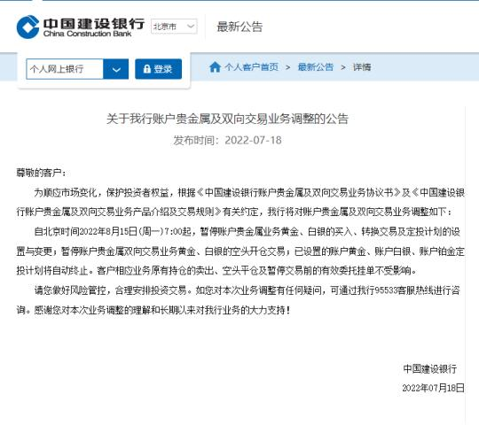 7月18日,建设银行发布公告称,自8月15日7:00起,暂停账户贵金属业务黄金、白银的买入、转换交易及定投计划的设置与变更;暂停账户贵金属双向交易业务黄金、白银的空头开仓交易;已设置的账户黄金、账户白银、账户铂金定投计划将自动终止。客户相应业务原有持仓的卖出、空头平仓及暂停交易前的有效委托挂单不受影响。