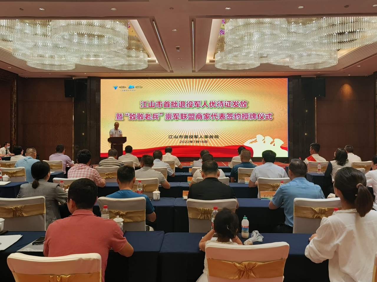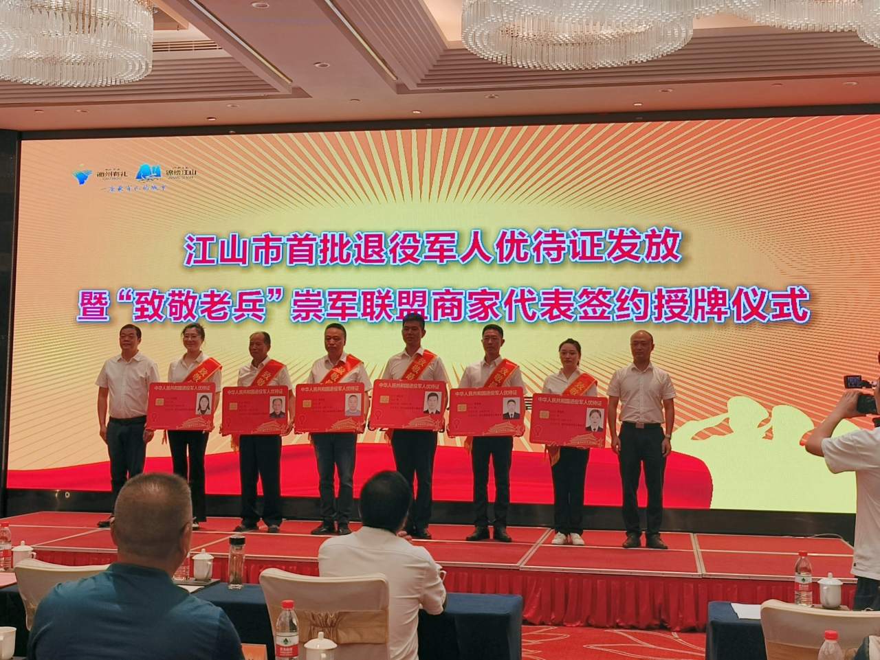 7月16日上午,江山市举行首批退役军人优待证发放暨“致敬老兵”崇军联盟商家代表签约授牌仪式。