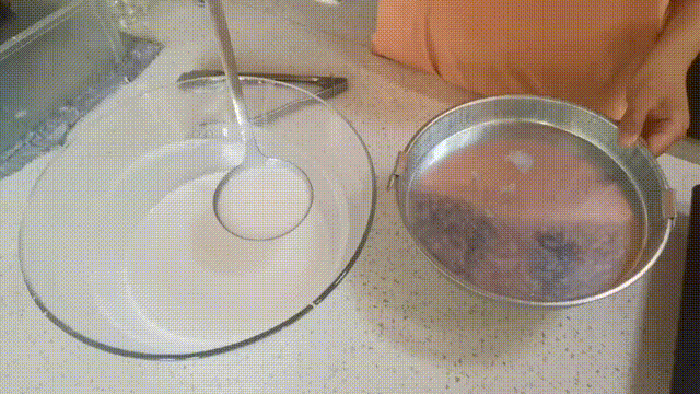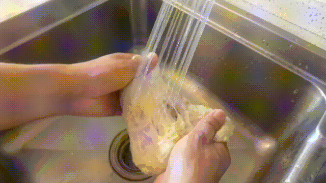 5、洗面就和洗衣服差不多,挫、揉、按,面筋碎了也没有关系。等洗面水很稠了,用纱布或滤网过滤洗面水,碎掉的面筋再揉一揉就成团了,换2-3次水,面筋就干净了。