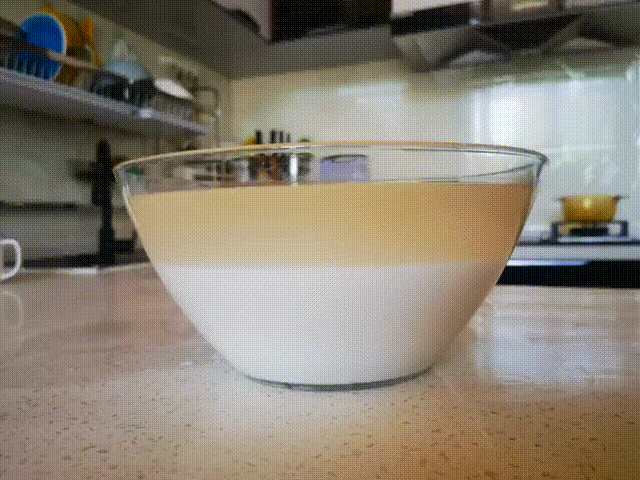 7、洗面水沉淀越久面浆越厚凉皮越韧,水倒得越慢越干净,底下的淀粉层倒到盆的边缘就可以停止了,剩下的搅和匀了就得到一碗优质的面浆,用收底窄口的盆沉淀倒出的水最多。