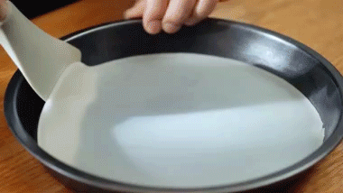 10、 连盘取出,放冰水或凉水冷却,刷熟油或橄榄油后,撕下(多张叠放的话,每张需抹上熟油或橄榄油,以免粘连)。