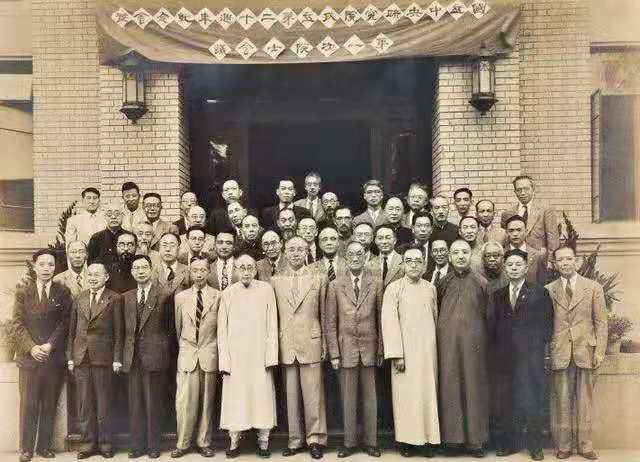 中央研究院第一届院士合影 前排:左五张元济,右四胡适。后排:左四陈省身,右一姜立夫。姜左下:苏步青(1948年3月29日摄于南京)