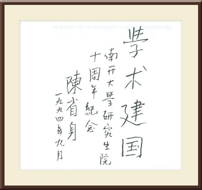 陈省身对南开数学所的工作精心照料,在南开大学陈省身数学研究所的档案室里,至今仍存放着陈省身与胡国定200余封便是明证。胡国定曾在一篇怀念陈省身先生的文章中写道:“那时先生与我的通信十分频繁,常常是他的来信我尚未回信,第二封信就又来了,每封信一、二、三、四一大堆具体事项。他的来信都编了号,有一次来信提出第几号第几个问题我尚未回答,这充分反映了先生叶落归根,服务国家的迫切心情。在先生的感染下,从此,我的去信也编了号。”