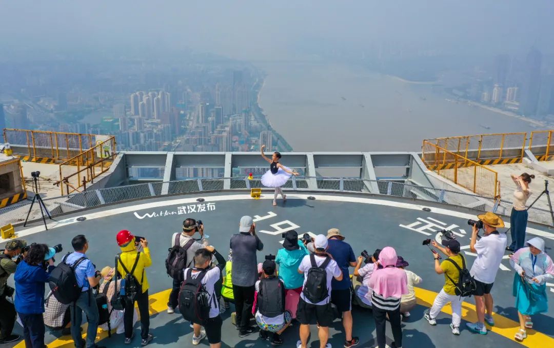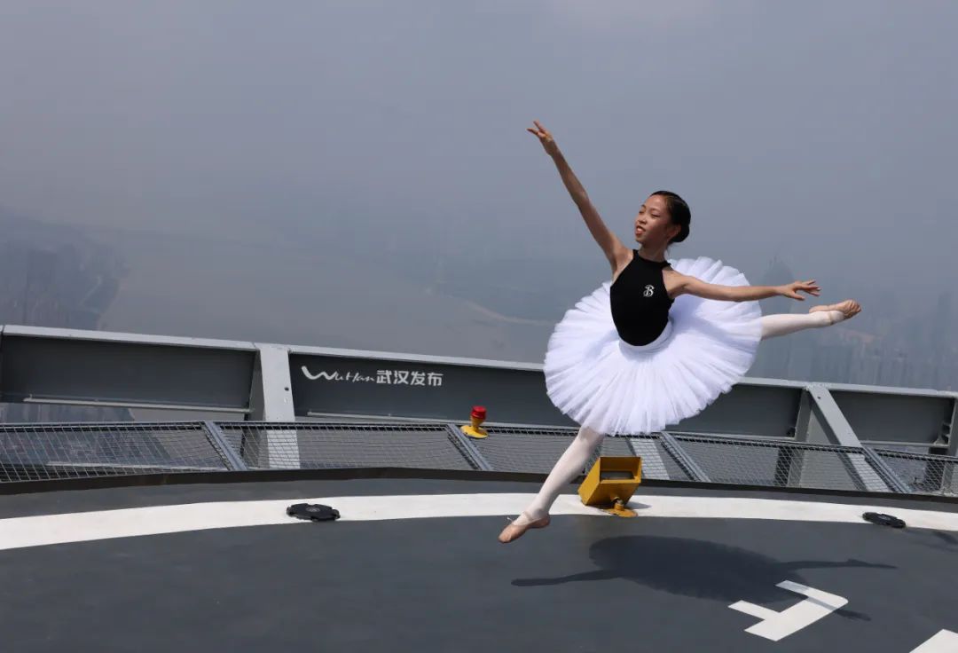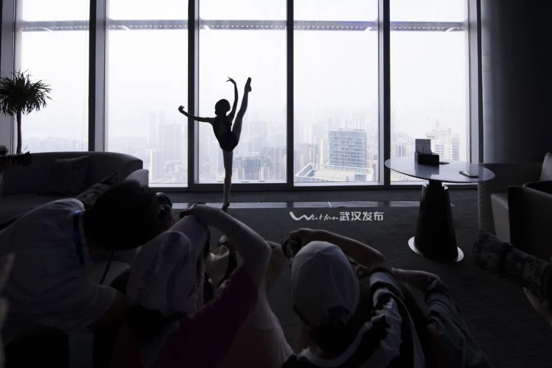 “城市影像空间站”的首次亮相,吸引一只“小天鹅”前来助兴。10岁的芭蕾舞小演员和摄影师们一起登顶100层的绿地中心停机坪,以长江为幕、天空为台,跳起轻灵的空中芭蕾。摄影师们端起镜头,无人机升到空中,争拍天际之舞和云上武汉。