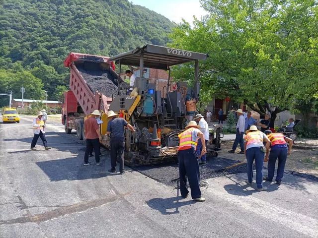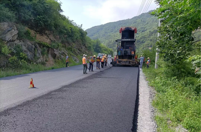 不仅仅是在青龙沟水库,新县国道G106线新光交界段至豫鄂交界段修复养护工程施工现场同样是一片火红,摊铺机和压路机轰鸣作响,十余名施工人员正忙碌着道路建设的收尾工作。