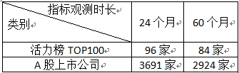 图5显示,活力榜TOP100平均的夏普比率(24个月)和夏普比率(60个月)分别达到了0.14和0.15,均高于同期的A股上市公司的平均值。