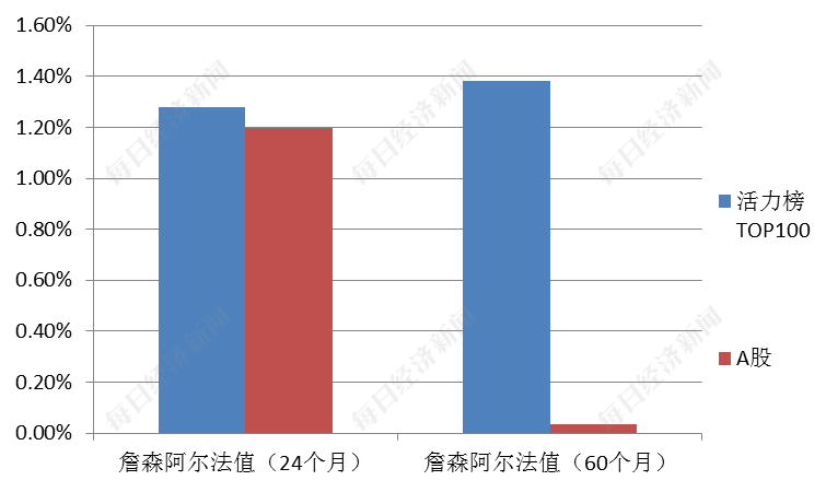此外,每经品牌研究院还使用詹森阿尔法值(标的指数为上证综指),衡量活力榜TOP100与A股上市公司股票超过理论预期收益的超额收益。