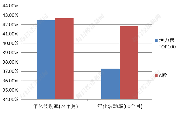 年化波动率通常被用来衡量总的投资风险。每经品牌价值研究院统计了活力榜TOP100与A股上市公司的平均年化波动率,包括24个月和60个月两种不同的观测时长。
