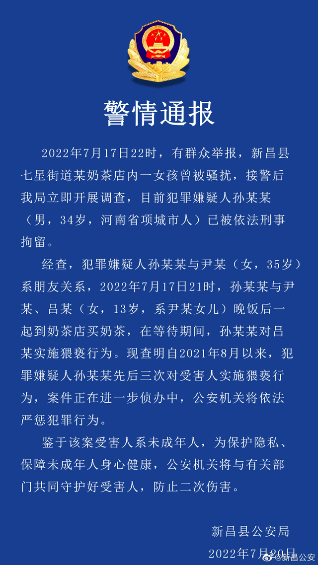2022年7月17日22时, 有群众举报,新昌县七星街道某奶茶店内一女孩曾被骚扰,接警后该局立即开展调查,目前犯罪嫌疑人孙某某(男,34岁,河南省项城市人)已被依法刑事拘留。