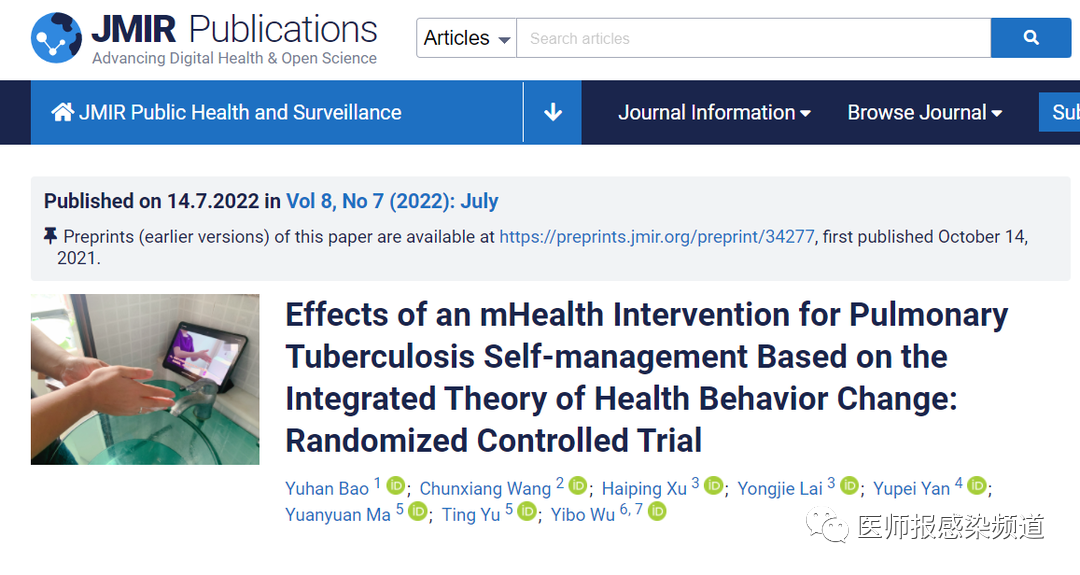 2022年7月14日,国际知名学术期刊《JMIR PUBLIC HEALTH AND SURVEILLANCE》(JCR Q1,IF=14.557)在线发表了北京大学公共卫生学院吴一波团队的研究论文,题目为“Effects of an mHealth Intervention for Pulmonary Tuberculosis Self-management Based on the Integrated Theory of Health Behavior Change: Randomized Controlled Trial”,公开了一项基于健康行为改变综合理论的健康干预对结核病患者自我管理的影响的研究。
