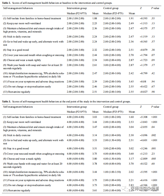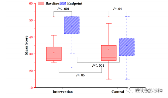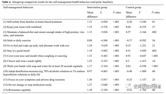 自我管理行为是本研究的主要结局指标,采用研究团队设计的结构化量表进行测量,一般自我管理行为包括与COVID-19相关的行为、用药行为和生活习惯。采用13种自我管理行为指标和5级Likert评分法,每个自我管理行为评分1-4分,1=无意行动,2=有意行动,3=行动但停止,4=开始行动,5=行动并考虑继续。得分越高表明自我管理行为越好。计算所有13种自我管理行为的总分。两组评分均大于基线(P<.001 vs P=.04),干预组总评分高于对照组(P<.001)(图1)。