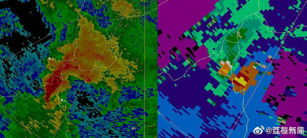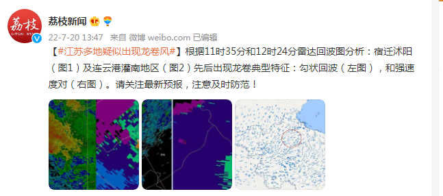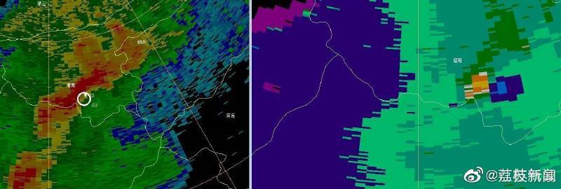 【#江苏多地疑似出现龙卷风#】根据11时35分和12时24分雷达回波图分析:宿迁沭阳(图1)及连云港灌南地区(图2)先后出现龙卷典型特征:勾状回波(左图),和强速度对(右图)。请关注最新预报,注意及时防范!