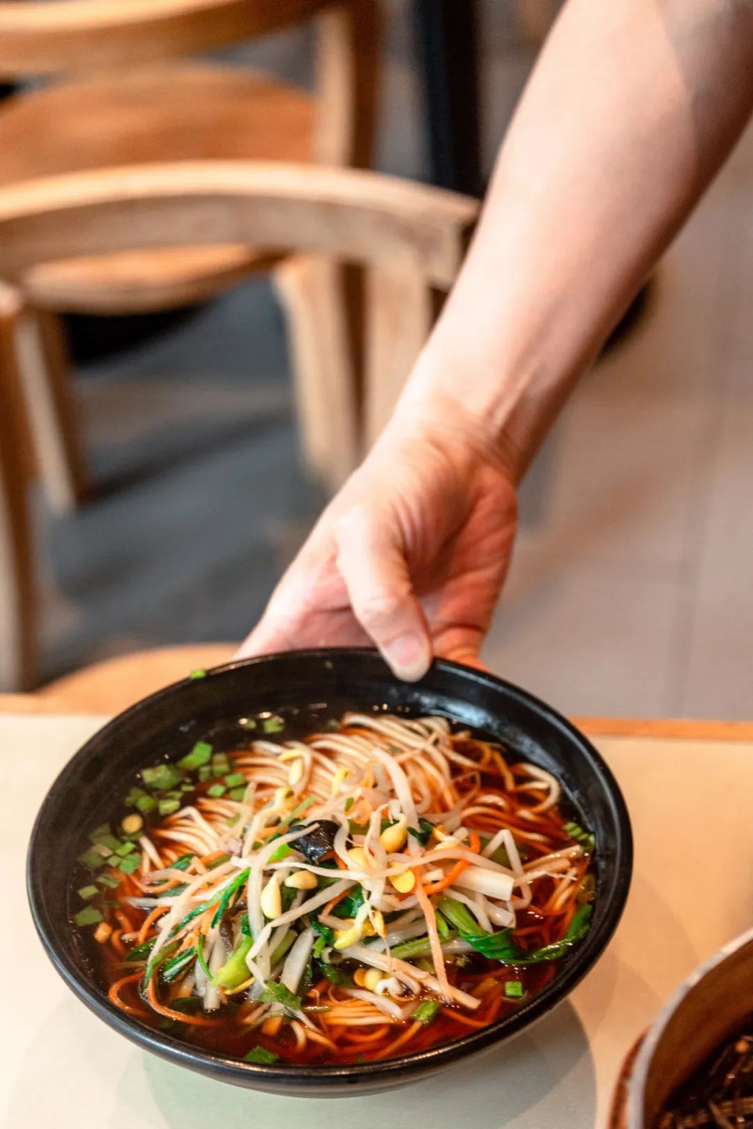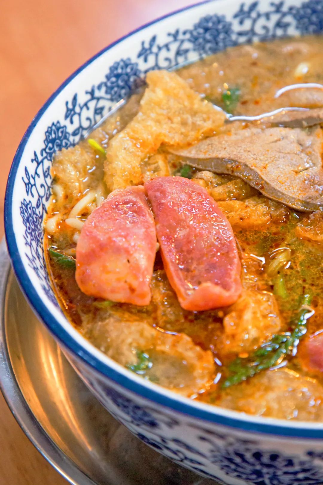 且不论用“电动小火车”送面上桌的仪(滑)式(稽)感。这碗三鲜皮肚面堪称教科书,面条劲道、皮肚软弹、猪肝香肠小青菜该有的全都有。