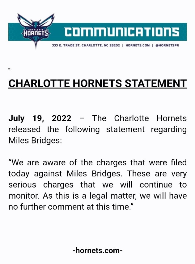 一旦这两项罪名成立的话,那么迈尔斯-布里奇斯的篮球职业生涯将会受到很大的影响。在刚刚结束的21-22赛季中,迈尔斯-布里奇斯一共为黄蜂出战了80场比赛,他可以场均得到20.1分、7篮板以及3.8助攻。
