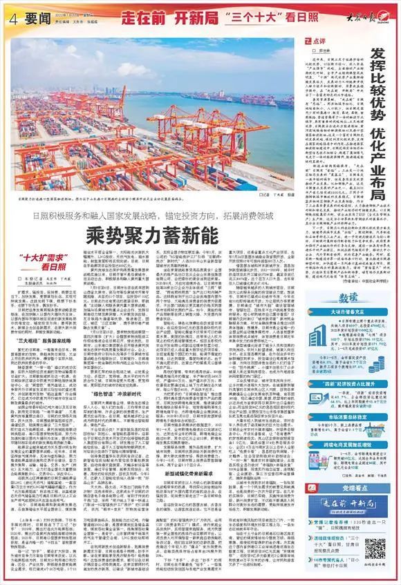 日照把自身发展同服务国家战略紧密相连,在加快融入以国内大循环为主体、以国内国际双循环相互促进的新发展格局中找准定位,锚定投资方向;善用新技术、新理念去创造新需求,在做大新兴消费市场的同时,积蓄发展新动能。