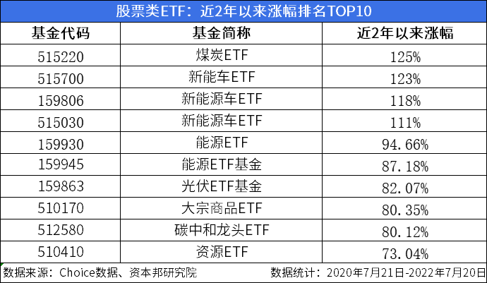 截至今日收盘,240只股票类场内ETF近2年以来实现上涨,涨幅靠前的有:煤炭ETF(515220)、新能车ETF(515700)、新能源车ETF(159806)、新能源车ETF(515030)、能源ETF(159930),分别上涨125%、123%、118%、111%、94.66%。