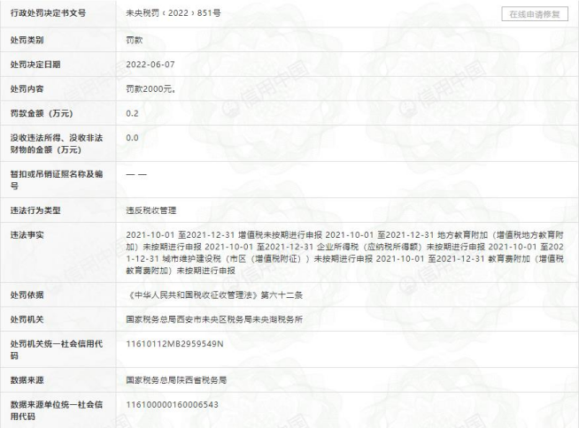 近日,信用中国网站公布的行政处罚决定书(未央税罚﹝2022﹞851号)显示,瑞幸咖啡(西安)有限公司未央第七咖啡店存在违反税收管理的违法行为,被国家税务总局西安市未央区税务局未央湖税务所罚款2000元。处罚决定日期 2022年6月7日。