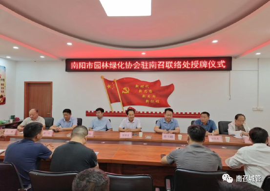 2022年7月17日上午,南阳市园林绿化协会驻南召县联络处授牌仪式,在南召县城管局三楼会议室举行。市城管局四级调研员郭家富、市园林绿化协会会长殷世甫、市园林绿化协会副秘书长郭启朝、市城管局教授级高工郝建隔、市城管局绿化科工程师谢琛,县城管局党组书记、局长邵书超、县城管局副局长汪虓及部分企业代表出席授牌仪式。