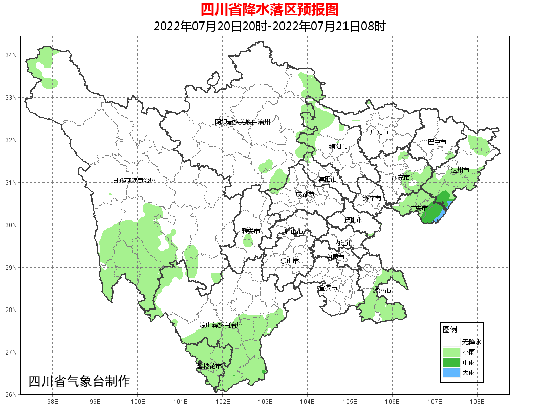 今天晚上:达州、广安、泸州3市多云间阴有阵雨或雷雨,局部有中雨,盆地其余大部多云;川西高原大部多云,其中甘孜州西南部有分散阵雨或雷雨;攀西地区阴天间多云,南部有阵雨。