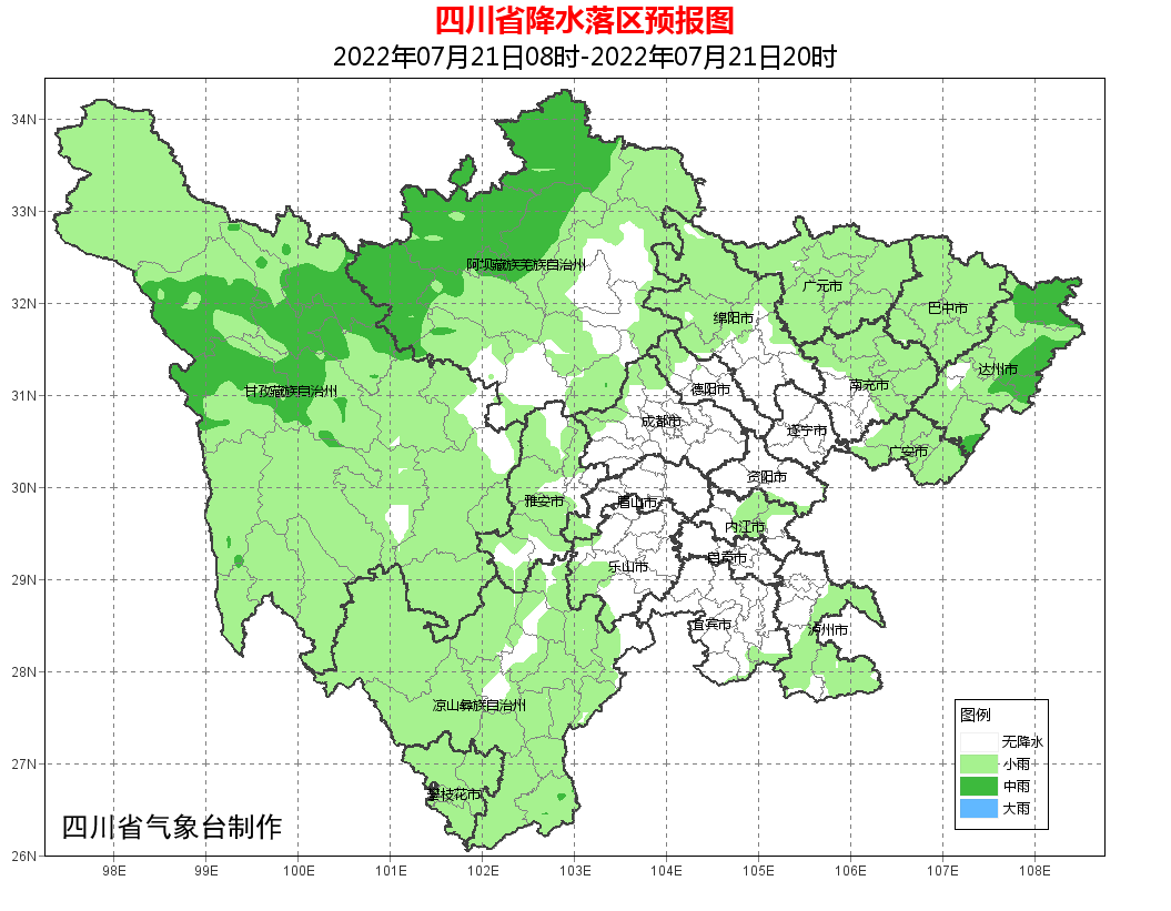 预计21~22日盆地阴天间多云有阵雨,部分地方中雨,局部大雨到暴雨,高原北部阵雨转晴,部分地方中雨,攀西地区阵雨转中到大雨;23~25日盆地晴到多云为主,局部阵雨,高原北部晴,局部阵雨,攀西地区阵雨,局部中雨;26日盆地阵雨,局部中雨,高原北部晴,攀西地区阵雨,局部中雨。