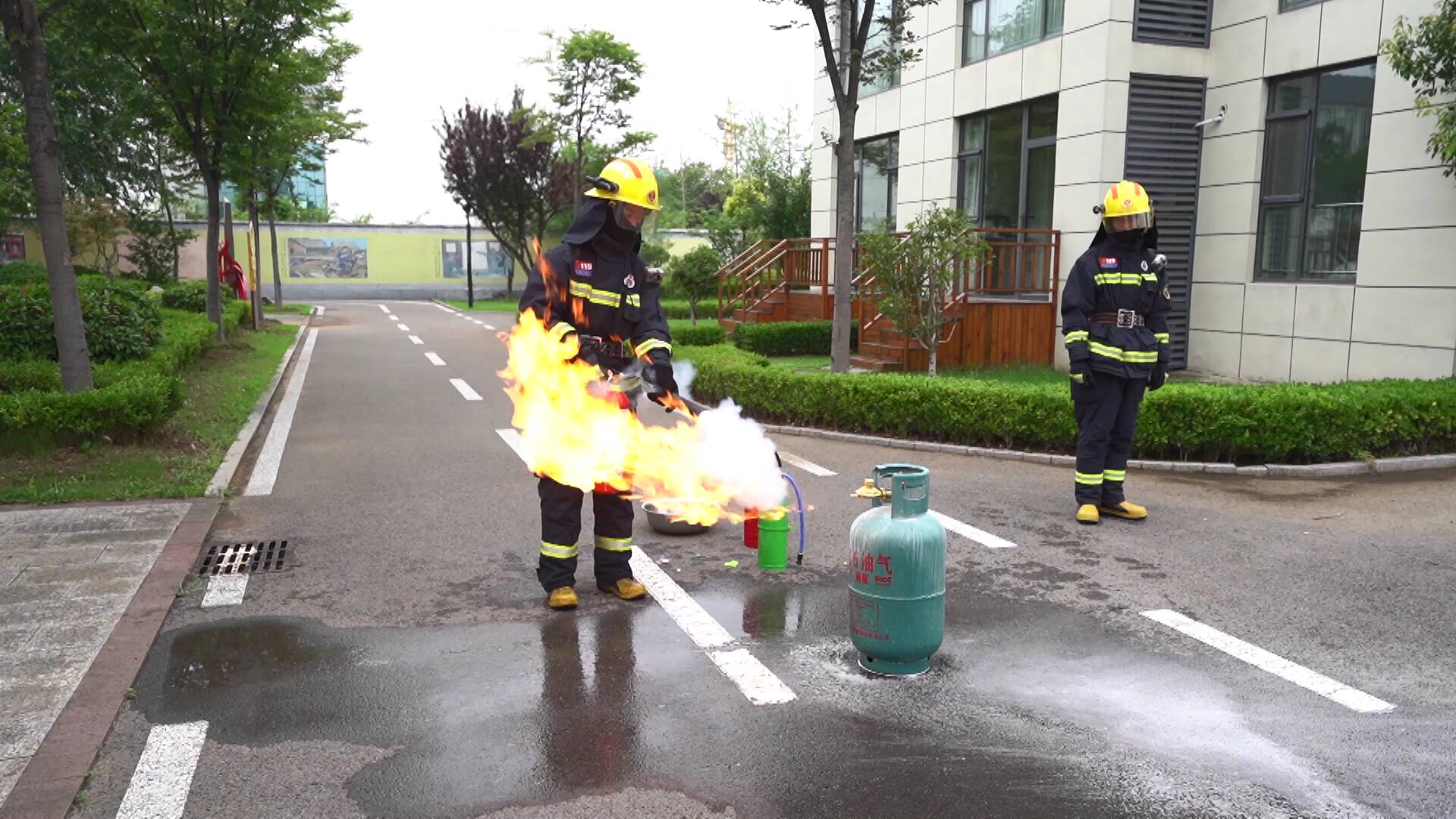 那在日常生活中,如果遇到煤气起火又该如何自救呢?临沂消防现场模拟了煤气起火场景并做了泼水灭火、水基型灭火器灭火、干粉灭火器灭火和二氧化碳灭火器灭火四个实验。