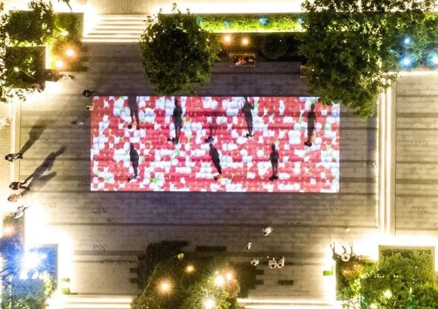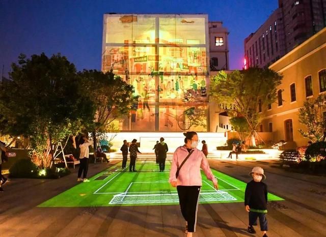 老楼墙面投映出年代老画片,茶余饭后的市民踩着地面投影翩翩起舞,到处都是老城复兴的繁华景象。